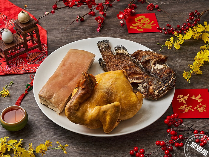 年菜外帶除了組合套餐及單品系列,更專程為年節祭祖必備推出「三牲巡禮」組合,每盒2,880元包含黃金雞、龍虎班及豬五花,方便傳統家庭以飯店美食恭奉祖先,聊表滿滿誠意與用心。