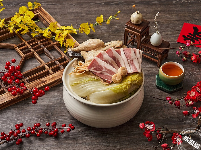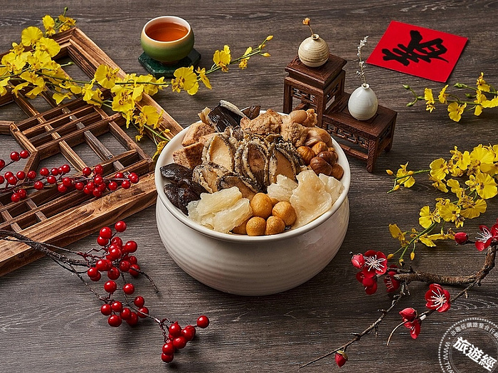 佛跳牆是團圓飯中必備的菜餚之一,板橋凱撒推出「一品鮑魚佛跳牆」,主廚將金華火腿及黃金玉米雞精心燜煮6小時成濃郁上湯,融匯珍珠鮑魚、海參、排骨、鵪鶉蛋、栗子、芋頭、香菇、白菜及花膠等豐富山珍海味入甕煨煮,湯頭濃郁爽滑不膩口,單賣售價每甕2,980元。