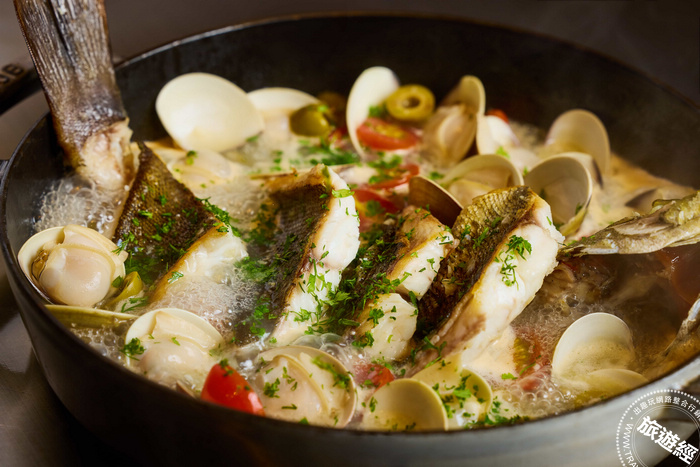 「義式水煮魚」利用白酒將蛤蠣鮮味封鎖在來自澎湖的黃雞魚鮮嫩的魚肉內。