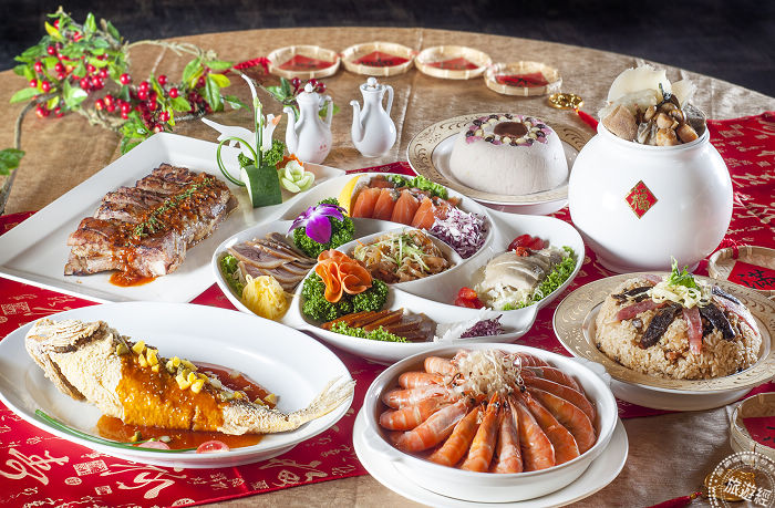王朝餐廳陳俊賢主廚,為新的一年呈現「薑蔥麻香蒸明蝦」、「碧綠蠔皇燴鮑甫」、「響螺蟲草燉雞湯」、「鳳脂甘露海皇斑」等山海珍味料理外,另外還有珍味東坡燒圓蹄、芙蓉蟹肉賀長年、港式臘味珍珠飯及過年必吃的佛跳牆,等經典年味菜色,完美呈現,讓主婦輕鬆擺上一桌美味年菜。也為了讓民眾方便選擇,更推出7道美饌8人份「金雞吉祥大福套餐」,菜色包括匯集桃香沐雲手、黃金烏魚子、煙燻鮭魚捲、滑嫩油雞、金絲海蜇五種美味象徵新年新春五福臨門的「吉祥如意五福盤」;特選豬肋排,以特製醬料醃製1天,再以兩段式火烤的「皇家蘑菇醬肋排」;大白蝦汆燙後,浸入主廚特調薄鹽和風醬汁,讓白蝦吸滿醬汁精華的「和風甘露海中蝦」,以及「凱撒一品佛跳牆」、「鳳凰芝麻糖醋魚」、「港式臘味糯米飯」與「金牌八寶甜芋泥」等!