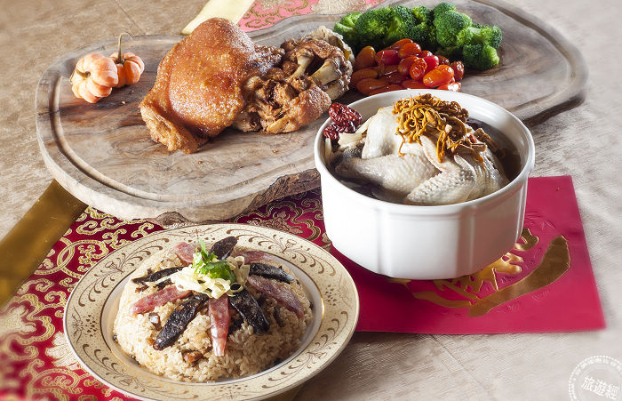 另外還有8人份3道美饌組成的「金雞吉祥小福套餐」,包括甘甜的「響螺蟲草燉雞湯」與香氣濃郁的「港式臘味糯米飯」,還可以品嚐王朝餐廳的經典美味「凱撒脆皮豬腳」等。