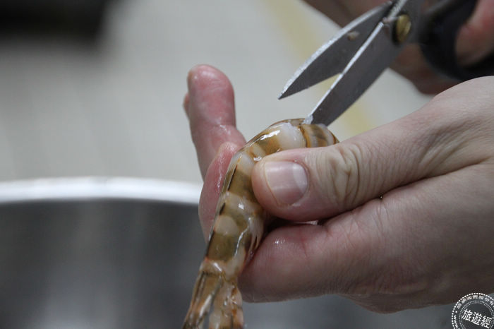 一、首先先將明蝦去鬚和蝦腳,之後再剪開背部,再挑出蝦腸清洗乾淨。