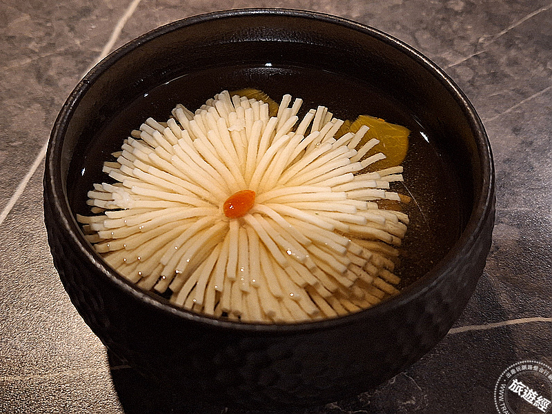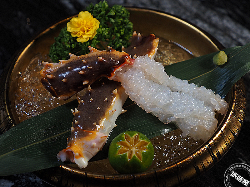 緊接重頭戲──「帝王蟹五吃」隨即登場,整隻帝王蟹豪邁上桌,在專業服務人員巧手烹調下,演繹出五段層次鮮明的味覺饗宴。首登場,即是台灣美食市場少有的「帝王蟹腿生食」,因為「活」、「鮮」才感端出,鮮嫩蟹腿刺身與現磨山葵相伴,微辣山葵在舌尖綻放,襯托出蟹肉自然甜美與彈牙;第二吃「奶油大蔥烤帝王蟹腳」小火慢炙,蟹肉保留原始鮮味,奶油與大蔥香氣加上肉質的鮮美緊實迸出新層次,讓人吮指有味;第三吃「涮煮帝王蟹身」講究食材新鮮度,厚實蟹肉在柴魚昆布湯中輕輕滑入,濃郁海味與湯汁的鮮美與甘甜蟹肉相融,吃出不一樣的蟹肉滋味;第四吃「帝王蟹肉蒸蛋」蟹高湯與滑順蛋液完美融合,加上多樣海鮮交織,每一感溫潤,卻海味十足;第五吃「帝王蟹膏粥」取蟹殼與蟹膏小火熬煮,米香與蟹香交織,為饗宴畫上溫柔句點。