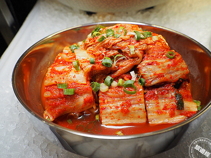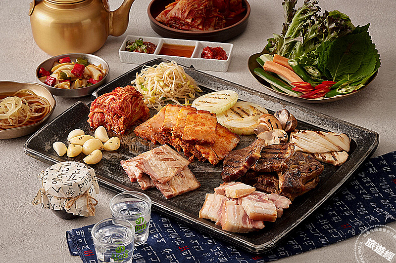 韓國人餐桌上不可或缺的「韓式烤肉」亦在餐檯重現,主廚分享以鳳梨、洋蔥、水梨、蘋果與啤酒醃製肉質,可以軟化纖維並帶出果香,再拌入辣醬與水果烤肉醬,風味清爽不油膩。鐵板區提供三款招牌肉品:「韓式川辣豬五花、韓式碳烤豬肉、韓式碳烤板腱牛」,搭配美生菜與三款特製醬料,重現正宗韓國烤肉魅力。假日午晚餐限定更升級為「現煎帶骨牛小排」。