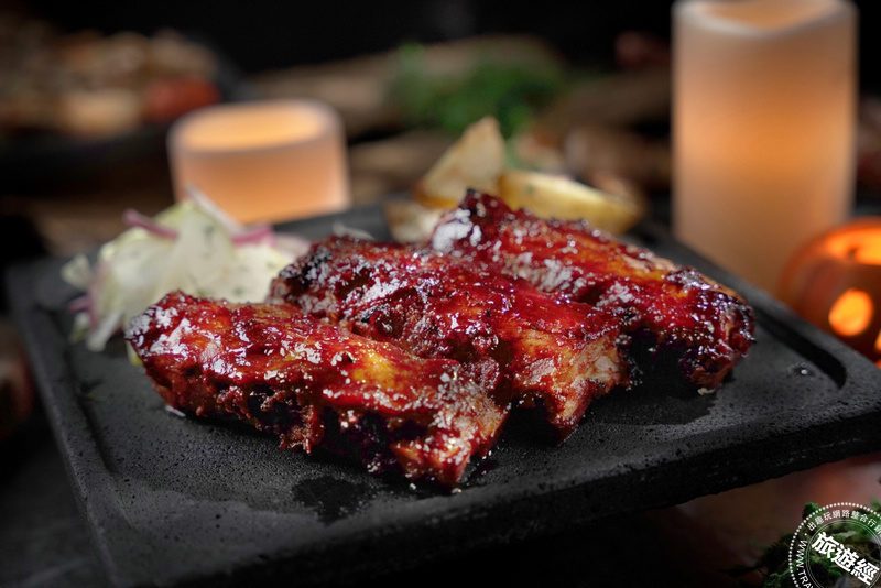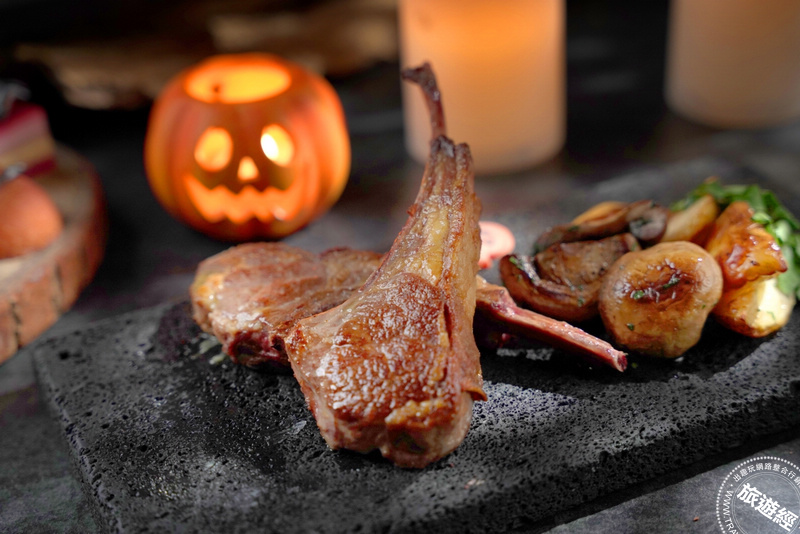 萬聖節饗宴的主餐「碳烤12oz豬肋排佐珍珠洋芋」嚴選台灣豬肋排,以西西里香草與初榨橄欖油低溫醃漬入味,炭火慢烤鎖住肉汁,外層焦香微脆、內裡柔嫩多汁。肉香交織著淡淡煙燻氣息,口感層次豐富。「碳烤羊排佐珍珠洋芋」 採用紐西蘭小羔羊排,經迷迭香與蒜末醃漬後碳烤至五分熟,草本香氣融合肉汁,搭配松露鹽拌洋芋,風味優雅平衡。「碳烤6oz肋眼牛排佐珍珠洋芋」選用美國Prime級肋眼,以西西里直火碳烤,外焦內嫩、香氣濃郁,雖用簡約調味,卻展現極致原味。