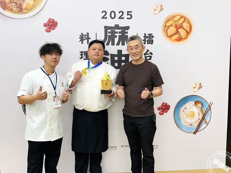台北凱達大飯店行政主廚戴于益(右)指導研製,家宴中餐廳主廚簡偉倫(中)代表參賽,以經典佳餚「老火甘蔗頭麻油雞」勇奪「2025麻油料理擂台競賽」傳統組冠軍。