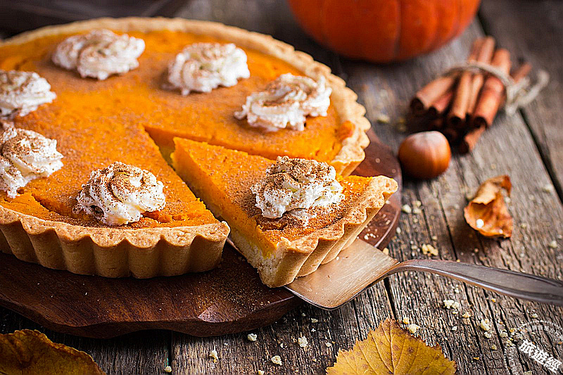 「經典南瓜派」是以香脆派皮搭配滑順的南瓜慕斯內餡組成,是感恩節最佳佐味甜品。圖台北晶華提供