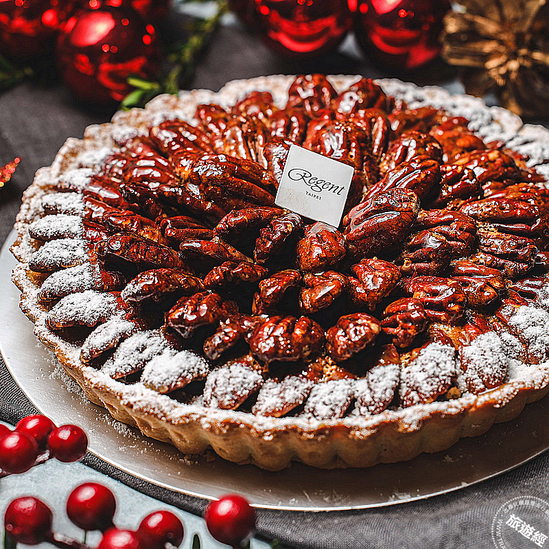 「美式胡桃派」內餡由楓糖餡與萊姆酒、香草精調製而成,最上層鋪滿胡桃烘烤,是口感香氣兼具的節慶甜點。圖台北晶華提供