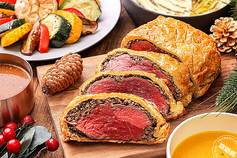 「威靈頓牛排」禮籃,將牛排香煎上色後塗抹蘑菇泥,外層以奶油酥皮包覆並刷上蛋液,高溫烘烤至金黃酥脆,香氣濃郁誘人。圖台北晶華提供