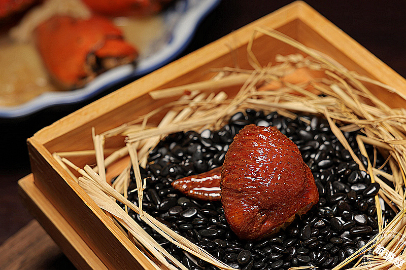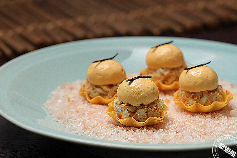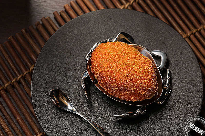 其中冷盤「魚子蟹膏凍」是以蟹殼滷水為底,將蟹黃、蟹膏與蟹粉疊構出晶瑩剔透的立方體,上方綴以魚子醬,呈現精緻奢華的美味;「蟹肉布甸」是將經典粵菜「蔥薑炒蟹」用創新冷菜手法呈現,將螃蟹拆解重組後,蟹肉與蔥薑細膩拌勻,蟹殼與蟹膏經乳化處理製成冰淇淋口感,最上方點綴以陳皮絲,層次風味令人驚喜;「金蟬鳳翼」則是以鹽炒提香後的大閘蟹蟹粉為內餡、鑲入去骨的雞翅當中後刷上以麥芽糖、醋、酒和水調製成的脆皮水後靜置風乾,出餐前再以熱油淋炸三分半鐘,成品飽滿油亮,入口油脂豐沛、鮮香滿溢,搭配以蔗糖與鎮江醋熬製的蟹醋一同享用,風味更佳。「霸王蟹甲」是將手工拆取的沙公蟹肉與大閘蟹粉佐以洋蔥末、蒜末與少許奶油拌炒調味,接著細心鑲入蟹蓋中,裹上麵包粉後入鍋油炸至香脆金黃,香酥與鮮滑並陳的特殊口感,以及精心挑選的銀器盛盤,大大提升品嘗秋蟹的儀式感。