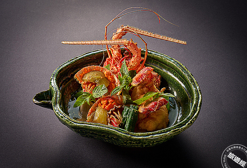 11月再度客座晴山的一木敏哉料理長,選用冬季盛產的漁獲,搭配美福鮮牛推出「食之都美食大使 匠心旬味」冬季套餐,餐前小湯端上暖胃生薑湯,味辛卻溫和的生薑,搭配些許砂糖熬製,溫和暖胃。先付前菜「銀湯蒸白子」選用冬季特有色澤雪白的鱈魚白子,因捲曲的外觀又名為雲子,以柴魚及昆布熬製的高湯蒸煮,口感滑順細緻,帶有清香海味。接著端上的煮物椀「茶湯黃金伊勢龍蝦」肉質鮮美的伊勢龍蝦,沾裹上蛋黃後油炸至表面金黃,再搭配一木料理長獨家研發的「柴魚茶湯」,飽滿的海味中帶著淡淡茶香,甘美清甜。