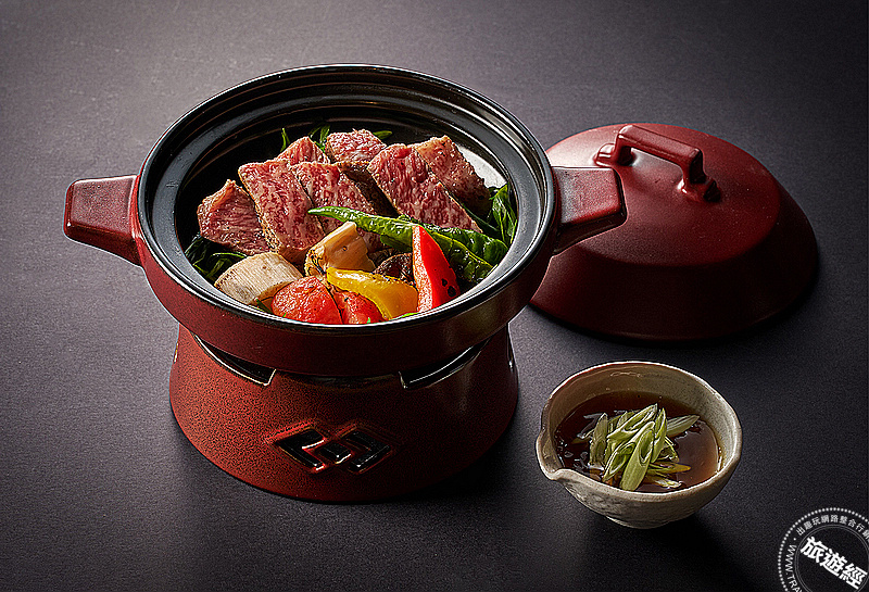 日式燒物「沙朗牛陶板燒」,將肉質鮮嫩的沙朗牛肉以炭火炙烤表面,再淋上特調的南蠻醬,上桌時由賓客依喜好的熟度續烤,牛肉透過陶板熱度釋放鮮美脂香,搭配南蠻醬香,風味鮮濃。主菜「日式鍋物」選用有白身魚王美稱的金目鯛,冬令盛產時期肉質肥美,再搭配冬季盛產的白蘿蔔、細嫩豆腐及時蔬,以小鍋方式上桌,清鮮湯底隨著熱度咕嚕嚕的滾煮,帶來暖暖的幸福感。