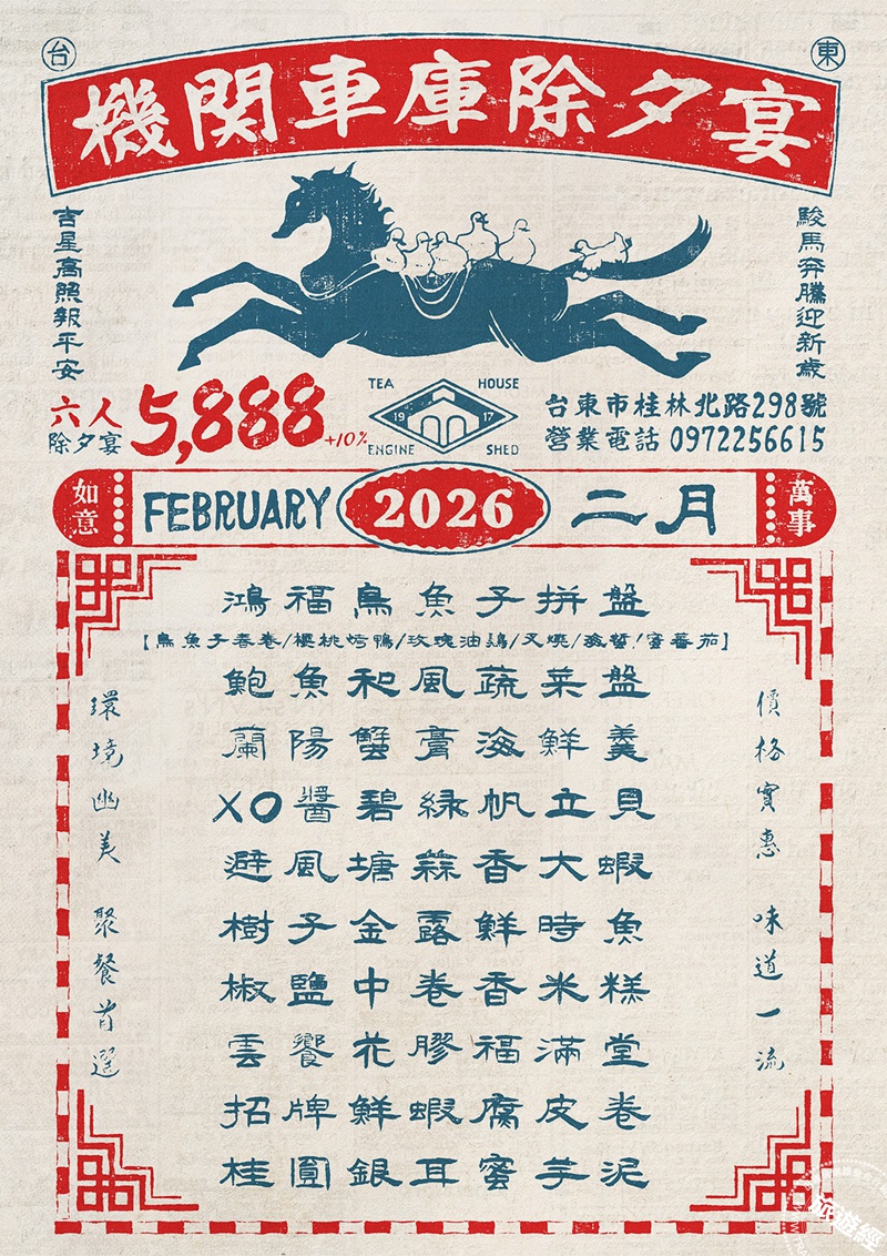圍爐除了在家或在華麗的餐廳與家人一起團圓吃年夜飯嗎?現在有一種難得體驗,可在歷史的建築空間品嚐「年的滋味」,位於台東,這座知名歷史建築「機關車庫Tea House 1917」將於2026年農曆除夕,將首度推出「除夕圍爐饗宴」,讓民眾在充滿復古氣息與歷史溫度的車庫空間內用餐,而且菜色還是由資深主廚團隊設計菜單,打造一系列經典粵式與在地風味結合的年菜料理,六人份桌菜僅需5,888元+10%,並提供年菜外帶預訂服務,為台東居民與返鄉遊子提供一個質感與美味兼具的新年新選擇。