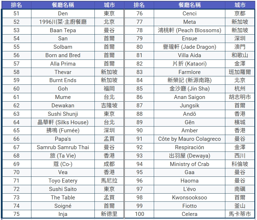 ※. 2026「亞洲 50 最佳餐廳」51-100名延選名單: