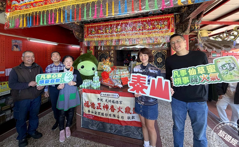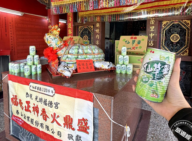 泰山食品捐贈120斤仙草蜜平安龜予交大光明福德宮,今年與全台12間土地公廟做祈福連線,捐贈仙草蜜、仙草茶做參拜使用以及奉茶給參拜信徒。