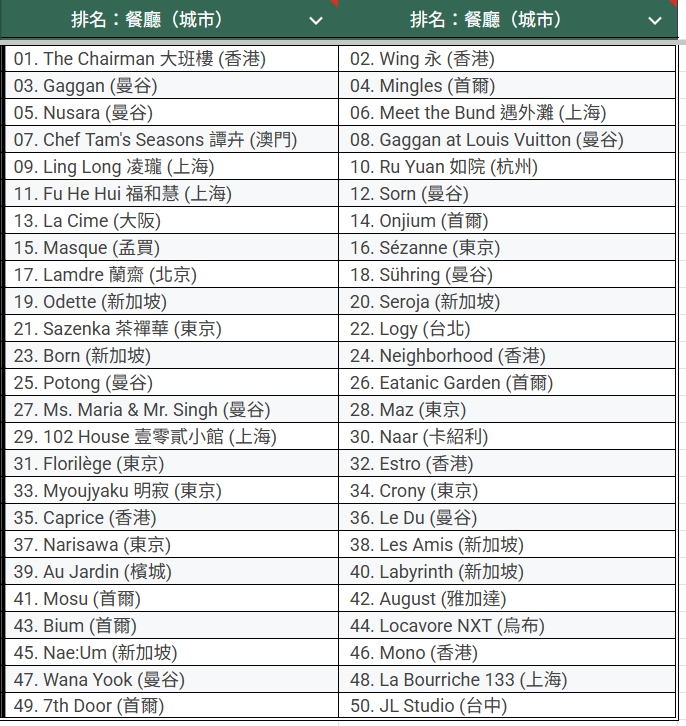※.2026 亞洲 50 最佳餐廳名單(1-50名):
