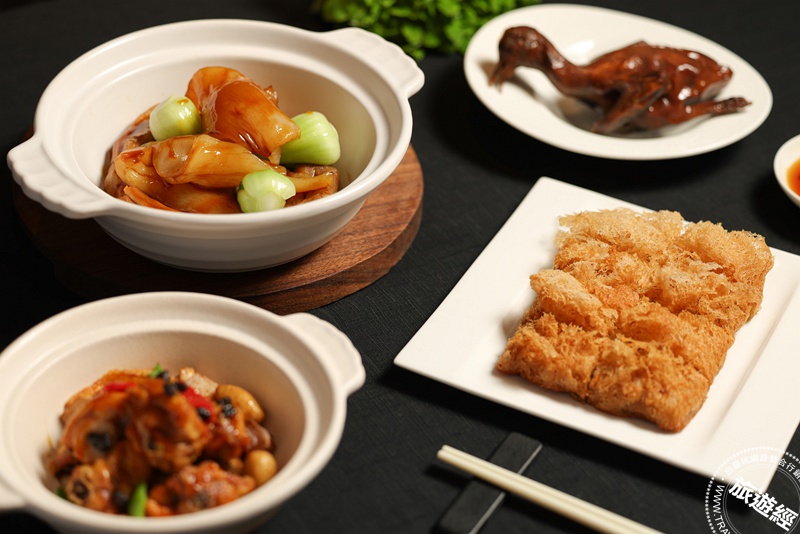 這波限定主題料理「四鳳呈祥」匯集鴿、鴨、鵝、雞四種珍禽佳味,來象徵春日豐饒與吉祥寓意。「脆皮燒乳鴿」選用台灣胭脂鴿,以傳統燒味技法料理,外皮酥香、肉質細嫩多汁。「香酥馬蹄芋茸鴨」將綿密芋泥包裹鴨肉酥炸,芋香與鴨肉鮮味交織,口感豐富、滋味迷人。「蠔皇鵝掌炆花膠」將花膠與鵝掌入鍋慢火炆煮,成品膠質豐厚、醬香濃郁。「乾蔥豆豉雞煲」則以玉米雞搭配乾蔥與豆豉煲煮,雞肉鮮嫩多汁、香氣濃郁。多道料理各具特色,展現粵菜細膩火候與層次風味,同時也展現了春禽盛宴豐富與精彩。