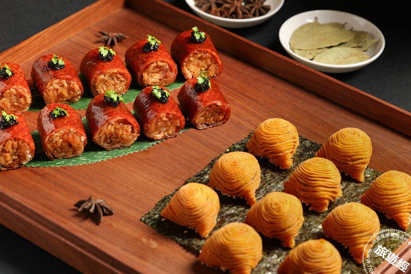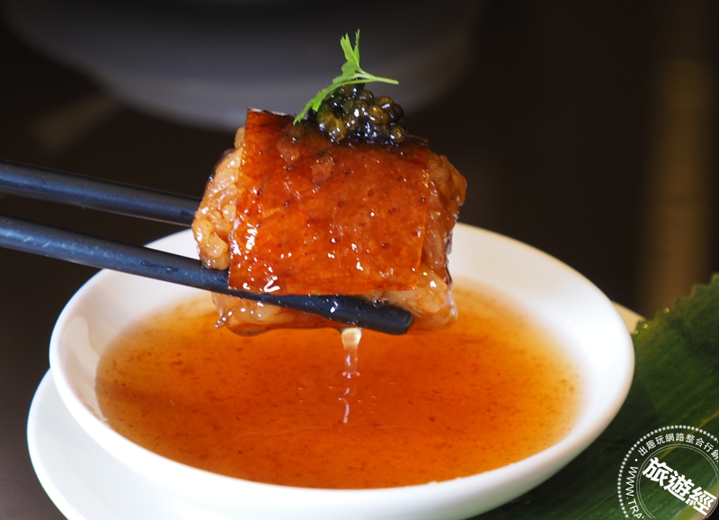 縱觀這次新菜色,最亮眼莫過於主打料理──「鴨箱寶雙味」,食材選用了彰化玉露鴨為主角,主廚以巧思將鴨肉轉化為兩款風味小點,呈現豐富的口感層次。「鴨箱寶」的命名靈感以寶箱意象,加上象徵將鴨肉的多重風味珍藏其中,也寓意珍味齊聚。其中一款如壽司狀,是將源自傳統將八寶飯填入鴨肚子裡再進爐燒烤而成的八寶鴨,改變它的味型重新解構,只取香酥鴨皮包裹八寶糯米餡,做成壽司狀後再進入烤箱一次讓鴨皮的油脂滲入糯米飯中,外層更加酥香、內餡則溢著軟糯油香,上方再點綴魚子醬再添鮮香及秀色。另一道為「黑椒鴨肉酥」則是取鴨肉製成千層酥點,內餡搭配黑胡椒提味,入口酥脆、香氣濃郁。兩款料理一酥一糯、一濃一雅,不僅展現鴨肉多樣風味,也體現主廚對食材運用的能力。