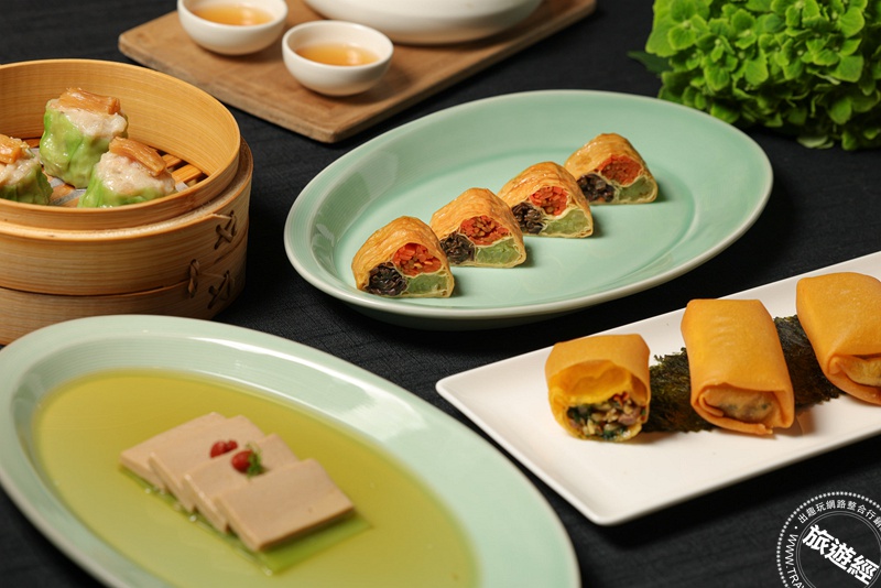 此外,菜單中亦規劃多款精緻前菜與港點,如:「老酒醉鵝肝」選用頂級鵝肝搭配紅棗與老酒醃漬,入口酒香悠長、口感細緻滑順;「雲煙素鵝卷」則以蟲草花、羊肚菌與萵筍為內餡,包裹腐皮後煙燻呈現,煙香輕柔、風味清雅;「春筍鴨絲春捲」以春筍與鴨絲為餡,採用空氣春捲工法炸製而成,外皮輕盈酥脆、層層分明,入口酥香不膩,春筍清甜與鴨絲鮮味交織,口感爽脆細緻;「瑤柱鵪鶉蛋燒賣」則以蝦仁、豬肉與香菇製成餡料,搭配溏心鵪鶉蛋與瑤柱提鮮,入口層次豐富,展現粵式點心細膩工藝。