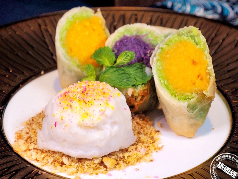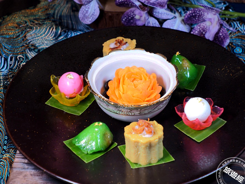 甜點融合泰國各地文化與寓意,「主廚特製綜合甜點拼盤」包含口感介於卡士達與布丁之間的「泰式黃豆糕」、以斑蘭葉米糕包裹芋泥內餡的「蒸芋頭糕」,以及以波羅蜜與椰肉製成的「椰香甜球」。其中波羅蜜在泰文中象徵「支持與助力」,寓意新年事事順遂,亦為節慶餐桌上不可或缺的甜點之一,另,還有「泰式酥炸嫩米南瓜紫薯」等。