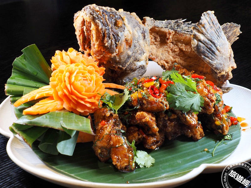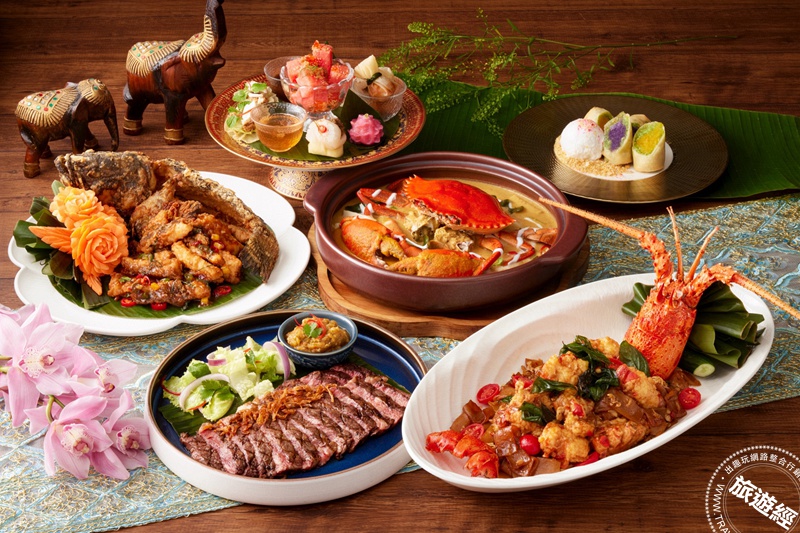 海鮮料理中推出「泰式辣炒龍蝦粿條」嚴選肉質彈嫩的澳洲水姑娘龍蝦與米粿條一同翻炒,粿條充分吸附龍蝦鮮甜湯汁,口感Q彈香辣並帶出鑊氣香氣;「主廚特製黃咖哩蟹」為泰南代表料理,選用近一公斤的肥美沙公,以薑黃、南薑、香茅與椰漿熬製濃郁醬汁,使咖哩香氣層層滲入蟹肉,展現泰南地區濃烈奔放的風味;「酥炸龍斑魚佐香茅紫蘇醬」則是將台灣龍虎斑以當地常用的酥炸呈現,搭配新鮮香茅、紫蘇與咖哩、辣椒調製醬汁,帶出魚肉酥香與多層次風味。