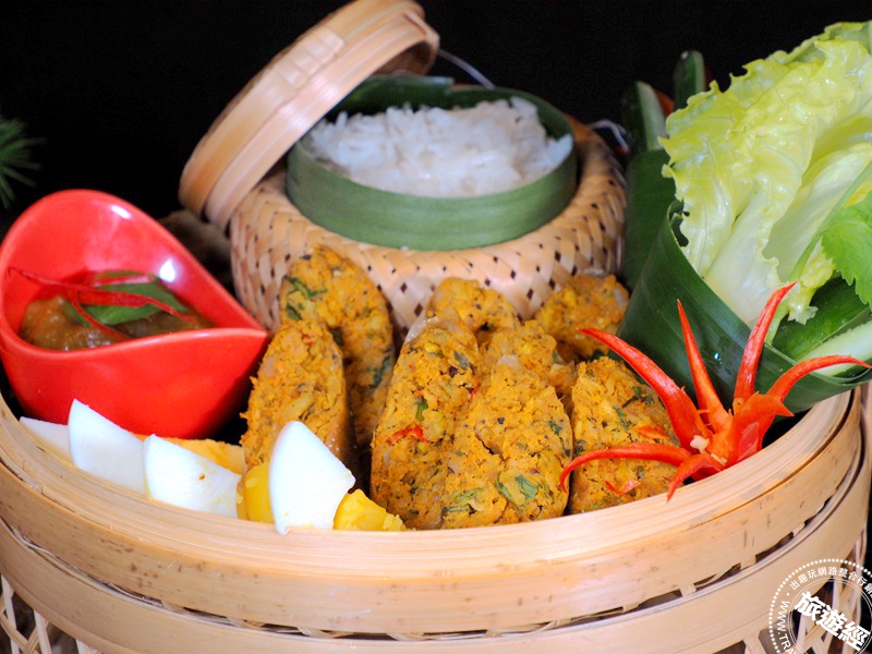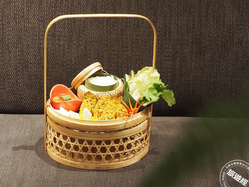肉類料理則端出「炭烤和牛佐泰式香料辣醬」選用油脂豐富的澳洲M9和牛肋眼,高溫炭烤後再以低溫慢烤至理想熟度,搭配以炭烤圓茄搗碎,加入辣椒、青檸與魚露製成的酸辣醬汁,平衡油脂風味;「清邁炭烤豬肉腸」復刻清邁傳統「ไส้อั่ว (Sai Oua)」,主廚以台灣溫體豬肉與檸檬葉、泰式香料親自灌製而成,炭烤後外皮微脆並帶煙燻香氣,搭配糯米與生菜享用,呈現道地清邁風味,而且其裝盛的器皿,運用了節慶或生日時「供養」時,民眾所用的竹編提籃,讓國人在台也能感受泰國節慶或特殊日子的喜悅傳統!