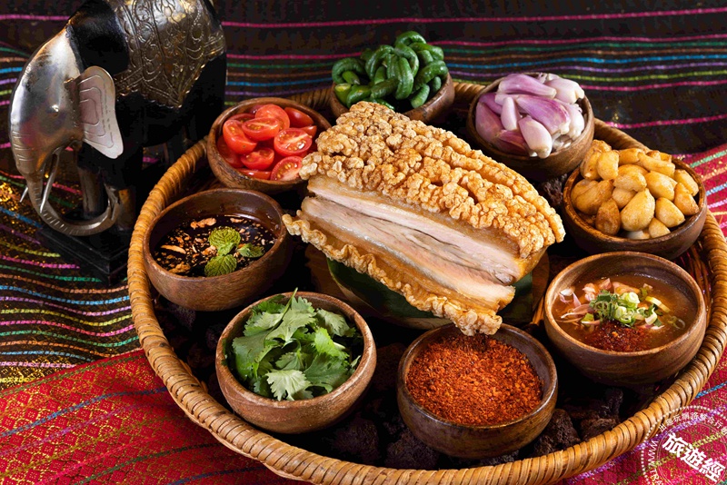 二、「泰式脆皮燒肉」:嚴選帶皮豬五花以香料醃製後慢火烘烤,接著將熱油淋於表皮,使外皮酥脆、肉質多汁,佐以主廚特製的鮮檸羅望果醬與椰糖黑醋汁,酸甜清爽的滋味完美平衡燒肉的豐潤油脂。