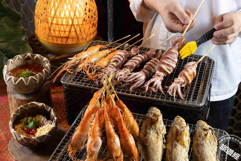 一、「現烤海鮮檯」:炭香四溢的現烤海鮮為熱食首推,海鮮種類包括:個頭碩大的泰國蝦、肉質彈牙的大魷魚以及油脂細緻的午仔魚,搭配傳統石臼辣醬與花生香蒜汁一同享用,更加襯托海鮮的鮮甜滋味。