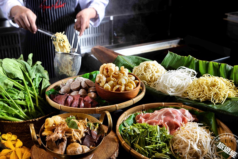 三、「泰式船麵」:為活動亮點,主廚以醇厚的豬龍骨高湯為基底,搭配米粉與黃麵兩種麵體,接著加入豬肉片、貢丸、新鮮豬血、炸豬皮、豆芽菜及空心菜等經典配料,最後淋上特製辣醬提味,堆疊出濃郁香辣的道地風味,讓饕客彷彿置身在泰國運河邊的小船麵攤,感受熱鬧迷人的街頭食趣。