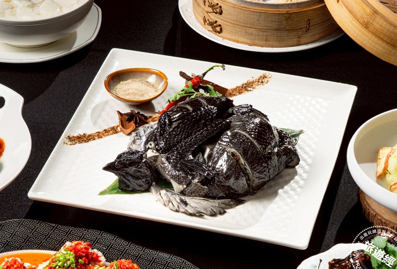 台北凱撒王朝中餐廳人氣招牌「蒜香黑鑽雞」。圖/台北凱撒提供