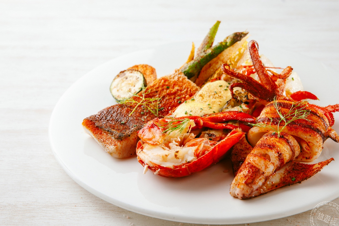主廚私房菜「燒烤海鮮拼盤」半隻波士頓龍蝦上餐盤,與透抽、鱸魚