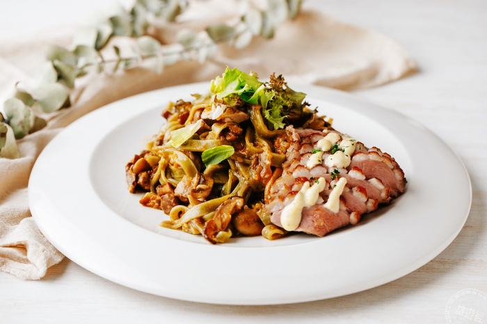 「菠菜寬扁麵佐櫻桃鴨胸及鴨肉蔬菜醬汁」