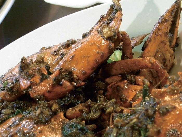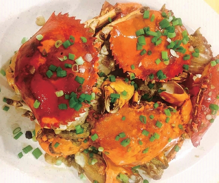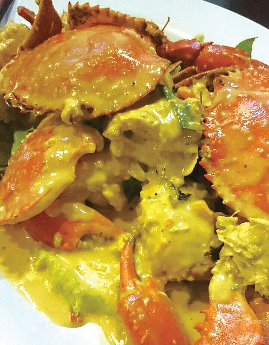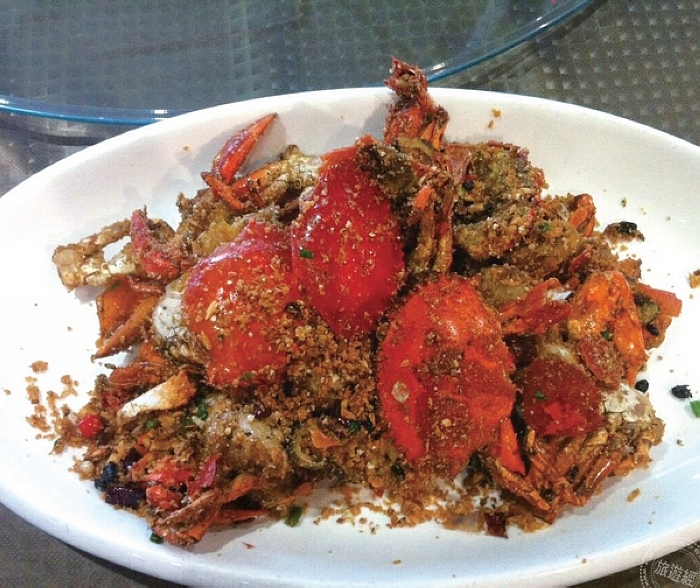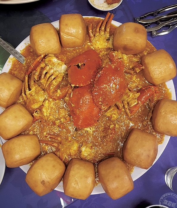 以咖哩調味的螃蟹料理,溫潤順口,加入蛋液增加濃郁的口感,是避風塘海鮮餐廳的招菜之一。搭配低溫油炸過的饅頭外酥內軟,可以沾附螃蟹的醬汁一同入口,或是拌飯一起食用,最能挑起旅客的食慾的一道菜。
