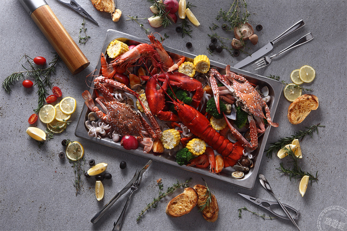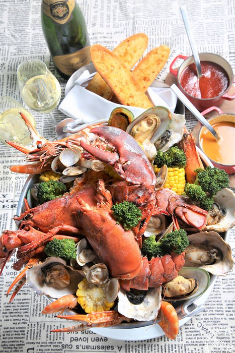海鮮桶將源自美國加州的特色料理,將海鮮滿滿裝盛於鐵桶內,並於上桌時如瀑布般倒入鐵盤,由饕客以手抓扒的豪氣吃法深受大眾喜愛。海鮮桶包括來自加拿大的整隻波士頓活龍蝦,碩大肥美、肉質極為緊實彈牙,同時匯聚紐西蘭淡菜、台灣嘉義蛤蜊、藍花蟹、海瓜子、生蠔、小章魚、紅皮洋芋、玉米、花椰菜等新鮮食材,並採用經典的水煮方式,以海鮮高湯簡單汆燙保留原汁原味,再與蕃茄醬、香蒜粉、辣椒醬及tabasco等特製的醬料充分混合,微微的酸甜辛辣襯托海鮮的自然鮮甜,讓民眾能豪邁的大快朵頤。
