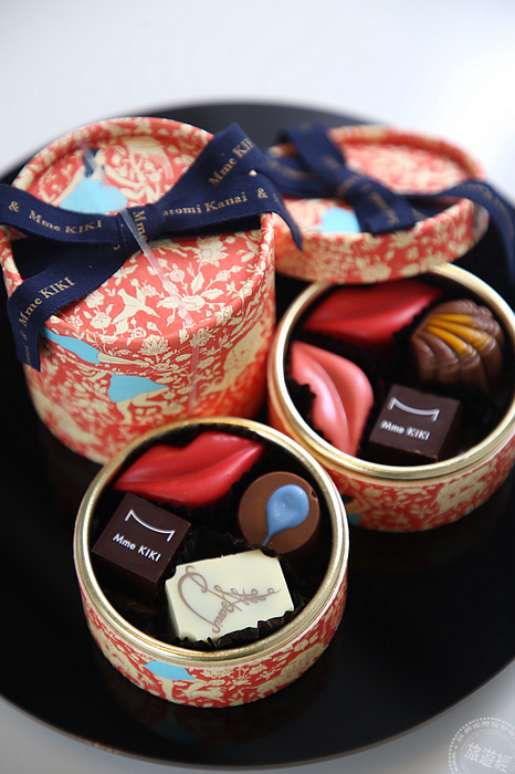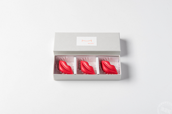 另外還有一款如女性性感紅唇般的起司蛋糕,以奶油起司慕斯與海綿蛋糕做為甜點主體,搭佐新鮮草莓及覆盆子果醬,另添加法國VALRHONA白巧克力塗層與沙布雷餅乾,一入口享有多重口感的美好滋味。魅惑紅唇_巧克力起司蛋糕每款NT$280(單入)、NT$1,860(7吋)。另外同樣以紅唇為造型的魅惑紅唇(巧克力),創作靈感來自曾為KIKI男友的美國攝影家Man Ray的作品-「天空中的唇印」。由於Mme KIKI社長與金井聰美主廚於摩納哥相識,而摩納哥一向以玫瑰聞名,主廚特別於巧克力甘納許中使用帶有玫瑰香味的焦糖,品嚐之餘彷彿與親密愛人熱情地接吻,齒頰之間帶有淡淡的玫瑰氣息!