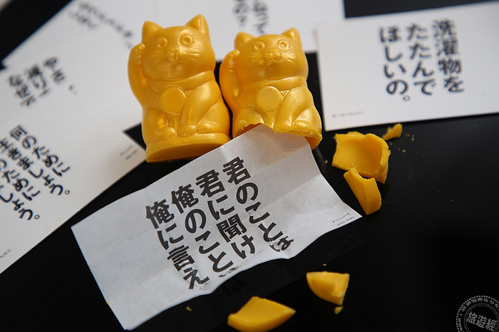 而另一款巧克力色澤相當特別,造型更是許多人喜歡的「招財貓」為造型的「招財幸運貓」,這一款甜品是Mme KIKI與現代美術家Hiroko Ichihara合作,以愛與笑容為主題,製作出以純文字表現的語言作品。Mme KIKI依照源自日本的幸運籤餅為構想,以招財幸運貓的可愛巧克力外型,將美術家充滿生活日常幽默感的作品包裝起來。招財幸運貓於日本為咖啡色,此次針對台灣推出的「金色」限定款,象徵中華文化的吉祥如意,每個作品裡均含有籤詩一枚!