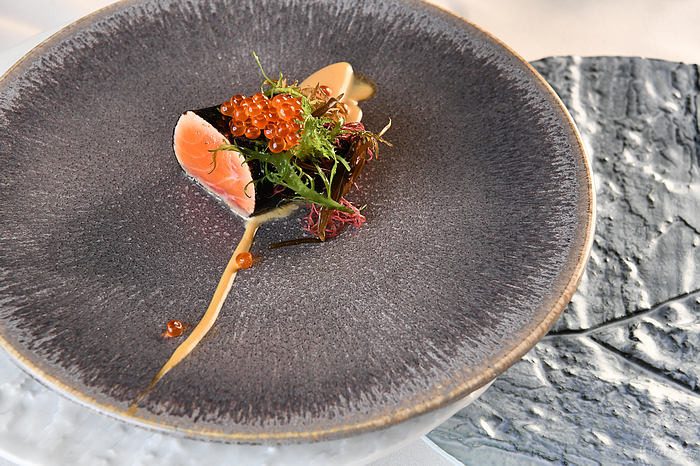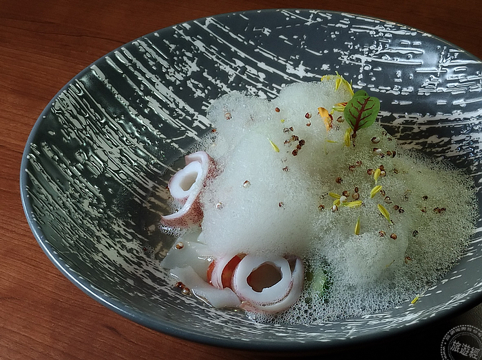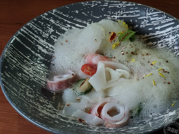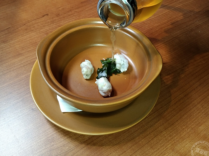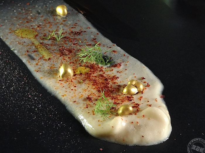 另一道「虱目魚澄清魚湯」,更將虱目魚魚湯完完全全的顛覆,這是一道桌邊服務的料理,主廚特地選用虹吸式咖啡壺做容器, 當湯液被加熱,往上翻騰,容器內的海帶芽如同復活般舒展,與手工自製的虱目魚丸一起跳舞旋轉,再加上植物界的鑽石──香料「番紅花」的「洗禮」,讓湯色展現金黃的剔透美色!