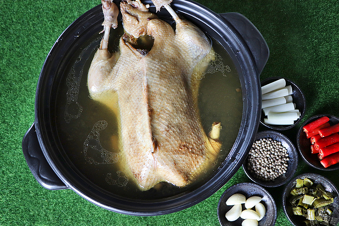 而烹調手法,先將胡椒拌炒直到聞到香氣,將四至五斤重的北番鴨做簡單清洗後與薑、蔥一起川燙,肉腥味較能去除。然後,再與胡椒、花菇、魚膠、陳皮等食材及調料一起放入鍋內以中火燉煮3小時,肉質肥美的白胡椒鴨,吸滿湯汁後的肉質,美味入口。也由於其湯品中火燉煮3小時,胡椒加熱膨脹後的辛辣香氣,能被鴨肉吸收去除鴨腥味,而加入陳皮除了能增加湯品風味外,還有開胃順氣的功效。