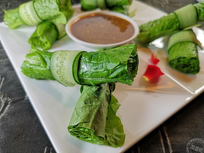 「麻醬鳳尾卷」讓青菜不是只有青菜,,這道涼菜主廚以中餐食材入菜、西式吃法的絕佳詮釋。選用無苦味、伴有清香甜味且營養含量較高的油麥菜,又名鳳凰菜,在洗淨過後再施以冰水浸泡30分鐘,保留其口感也讓鳳凰菜清脆爽口。而且此次主廚來台,還特別教授佐料作法,醬料中包括:花生醬、橄欖油、芝麻醬、生抽、鹽、芥末油等混製而成,讓清脆的青菜更顯清甜、香氣,展現道清新開胃菜!