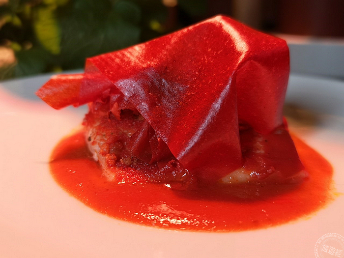 黑椒佩可瑞諾餃,紅蝦與鼠尾草(攝影:洪書瑱)