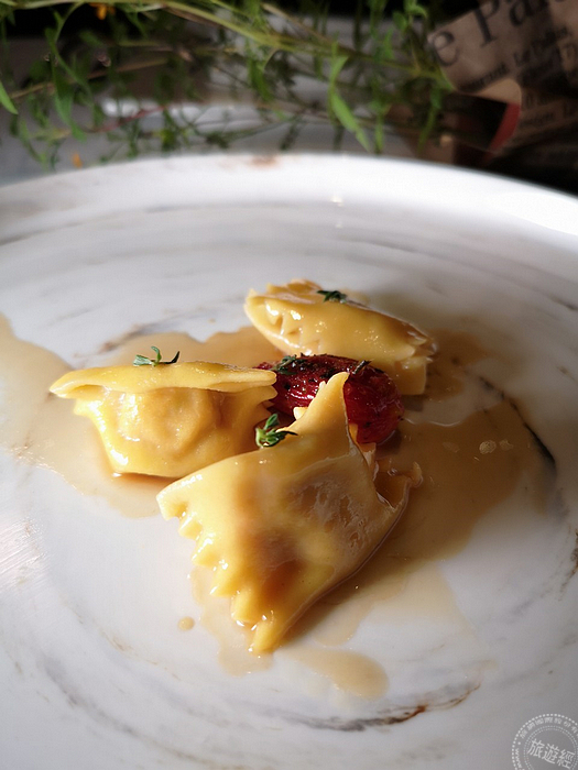 手工鴸雞肉餃 洋蔥醬與鮮茄(攝影:洪書瑱)