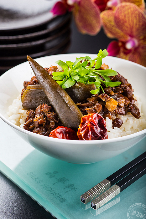 「麻辣香肉燥飯」則是晶華軒主廚蔡少華所推出,先將五花肉切丁、汆燙後放入滷鍋,再加入炸過的蔥、八角及米酒調味,烹調至肉丁鹹香入味後、續放烤過的燈籠椒、大紅袍等辛香料調味,配菜的部分則捨棄傳統醃製蘿蔔改採剝皮辣椒,一則滿足嗜辣饕客在同個餐點中享受到不同的辣味,二則解膩開胃。此道肉燥飯除了肉汁特有的香氣外、更增添了川菜特有的辛香辣口。