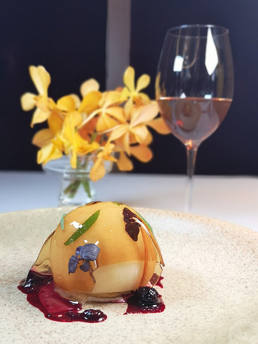 晚間套餐甜品──「法國白桃及香草冰淇淋」,則是主廚將這道十九世紀法國傳奇廚藝大師喬治斯.奧古斯特.埃斯科菲耶(Georges Auguste Escoffier)獻給歌劇名伶內莉.梅爾巴(Nellie Melba)的浪漫甜點「水蜜桃梅巴爾(Pêche Melba)」玩轉成「水蜜桃梅巴爾.東加豆冰淇淋」,新鮮加州水蜜桃以24秒真空滲透方式保留甜脆多汁,溫柔包裹南美洲雅馬遜獨特東加豆製成的冰淇淋,重頭戲的覆盆子醬,散發玫瑰香氣的覆盆子慕斯,結合液態氮手法由專人於桌邊上演料理秀翻炒為冰沙,點綴在食材上與盤中,展現如畫一般的夢幻!