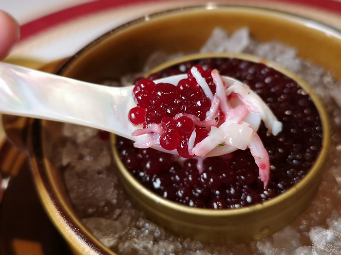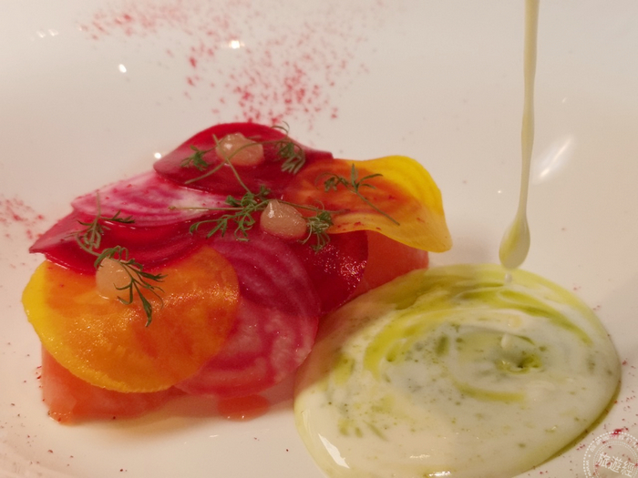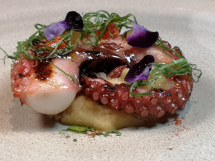 主廚為安東廳特別設計多款料理,如:猶如魚子醬般閃耀著璀璨光芒的「紅甜菜.帝王蟹.白蘆筍」,晶瑩透亮魚卵咬下瞬間,魚湯鮮美滋味與紅甜菜清甜芬芳,沁涼綻放唇齒之間,藏身於下的白蘆筍丁與蟹肉;「炭烤章魚.鷹嘴豆.西班牙臘腸」融入旅遊西班牙時品嚐的經典tapas料理「加利西亞風味章魚(Pulpo a la Gallega)」,先透過低溫舒肥方式軟化章魚肉質,再以不同於當地的料理方式,直火炭烤表面至金黃酥脆,迷人焦香氣息陣陣撲鼻而來,外酥內嫩口感搭配綿滑鷹嘴豆泥,顛覆西班牙傳統風味。