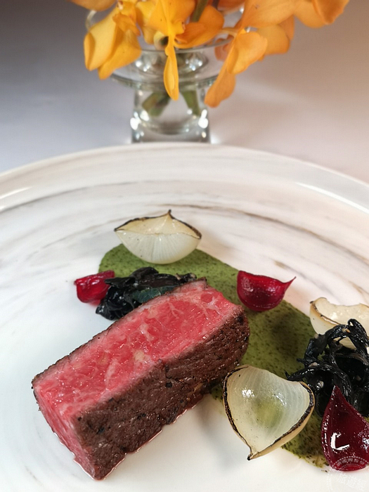 乾式熟成頂級無骨牛小排佐綠胡椒醬汁(攝影:洪書瑱)