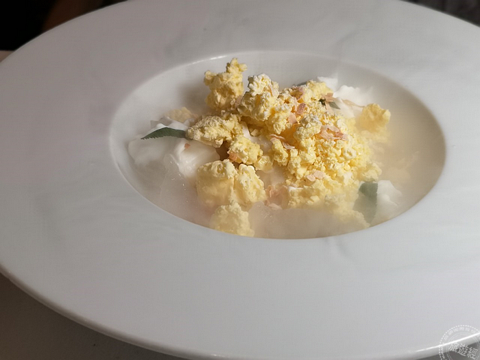 午間套餐甜品──「椰子.芒果.荔枝」則是以著名港式甜點楊枝甘露為創作靈感,將芒果、荔枝、椰子簡單食材幻化成多汁果肉丁、荔枝椰子冰淇淋、椰奶慕斯等各式迷人姿態,再由專人於桌邊以液態氮手法翻炒芒果椰奶慕斯為金黃冰沙,隨性鋪撒於盤中,不同的時食入口,產生不同的口感體驗與享受!