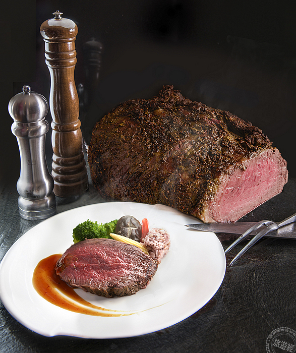 另外再以先穀飼、再肥育的澳洲戰斧牛排為另一主角,巨無霸牛排先經混合了海鹽、胡椒的多種香料,醃漬12小時,再將抹醬刮下鋪在烤盤底,把重新塗了芥末醬的超大塊戰斧牛排擺上,澆淋橄欖油、入烤箱烤成六分熟度後、鮮美多汁!此一戰斧牛排於平日晚餐和假日全天候供應,平日午餐時段則提供美國燒烤牛肉,而且每個餐期各餐檯還有琳琅滿目的各種菜餚選項可供消費者選擇。