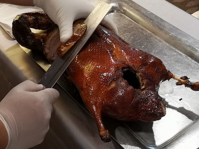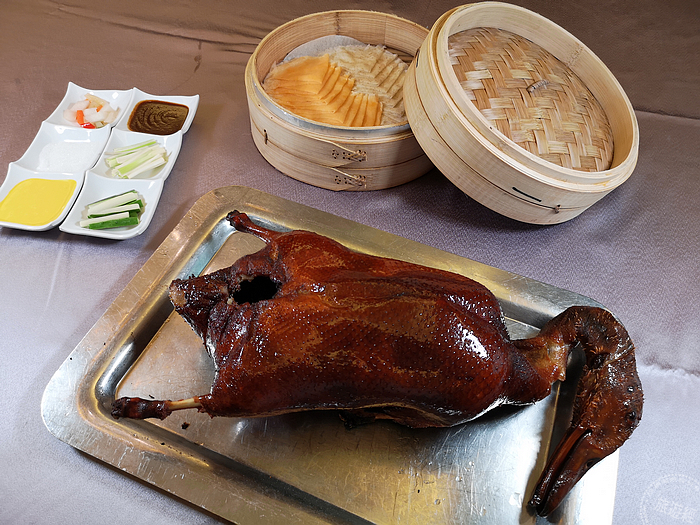台北華國飯店「帝國會館掛爐片皮鴨」向來都是饕客品鴨,推薦的必嚐入門款,首先餐廳選用3.5公斤宜蘭櫻桃鴨,經過多道工序,成為油亮豐嫩的焦香烤鴨,又在片鴨師精準的刀工下,一一呈現鴨皮香脆、鴨肉多汁,尤其腴滑的帶皮鴨肉層層堆疊,組合成絕妙的鴨香花肉盤,吃到三種口感,包括:脆皮、鴨肉帶皮,以及單純鴨肉,除了脆皮可以沾砂糖食用外,皮帶肉的鴨肉可以加入葱及小黃瓜加入甜麵醬包在傳統的麵皮及胡蘿蔔麵新品皮來感受傳統吃法,而單純的鴨肉還可以搭配獨家季節主廚特製的芒果醬料來食用!