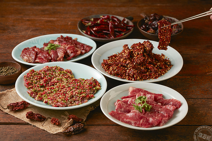 嗜辣者,享用乾辣椒粉搭配花椒粉製成的「麻辣嫩牛肉」,以及結合泡椒、青辣椒、紅辣椒的「泡椒嫩牛肉」,另外還有適合一般大眾口味的「醬油嫩牛肉」及「原味嫩牛肉」