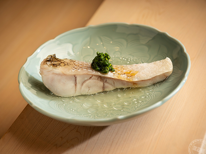 其中初冬菜色中「酒蒸白川甘鯛」是嚴選來自日本、產量稀少且要價不斐的甘鯛 (日本人稱之為 幻の白川甘鯛),將其洗淨切塊後以鹽稍微醃漬,再與日本純米酒一同蒸製而成,米酒的酒香完美吊出甘鯛的鮮甜,讓人著實著迷;另一道亮點則是「海膽香箱蟹」,香箱蟹就是雌的松葉蟹,在日本每年只有11月至隔年1月可以捕撈,主廚將蟹肉仔細拆出後鋪底,放上蟹膏與蟹卵,再搭配日本北海道的鹽水海膽,鮮上加鮮的極致海味;「海苔烏魚子年糕」則是新鮮日本烏魚子以鹽醃漬一天,接著以高度數的米酒頭浸漬一天,最後再花7到8天時間熟成,切塊後的烏魚子依序用年糕和海苔包覆等,道道都是「鮨ます田」獨門特色料理。